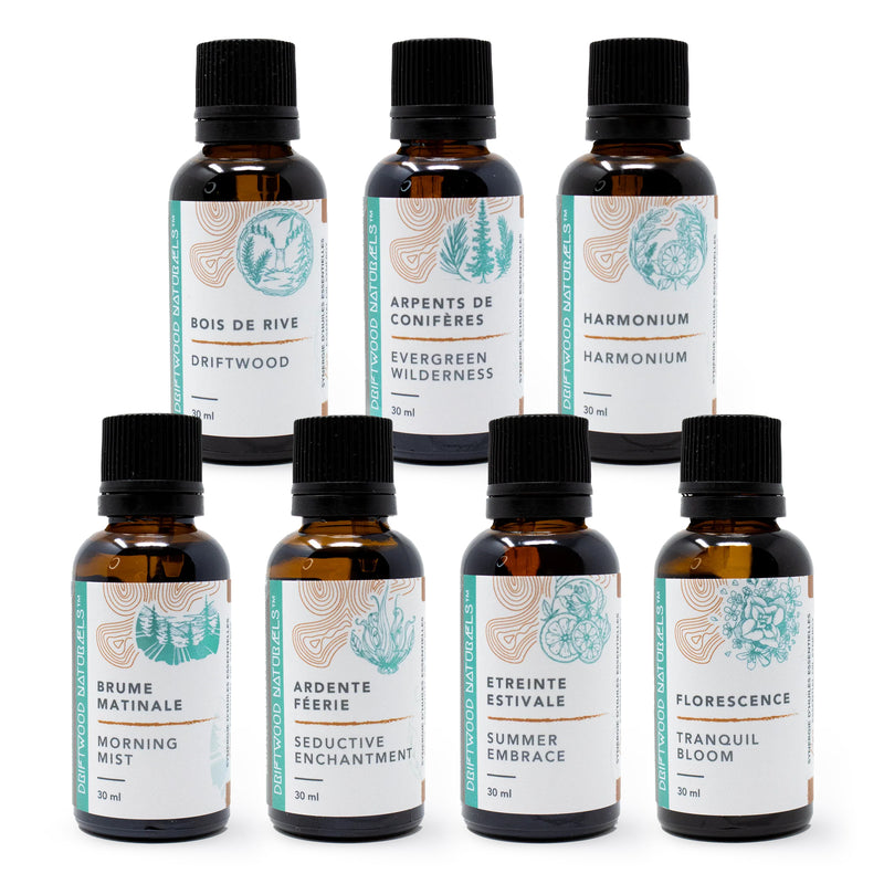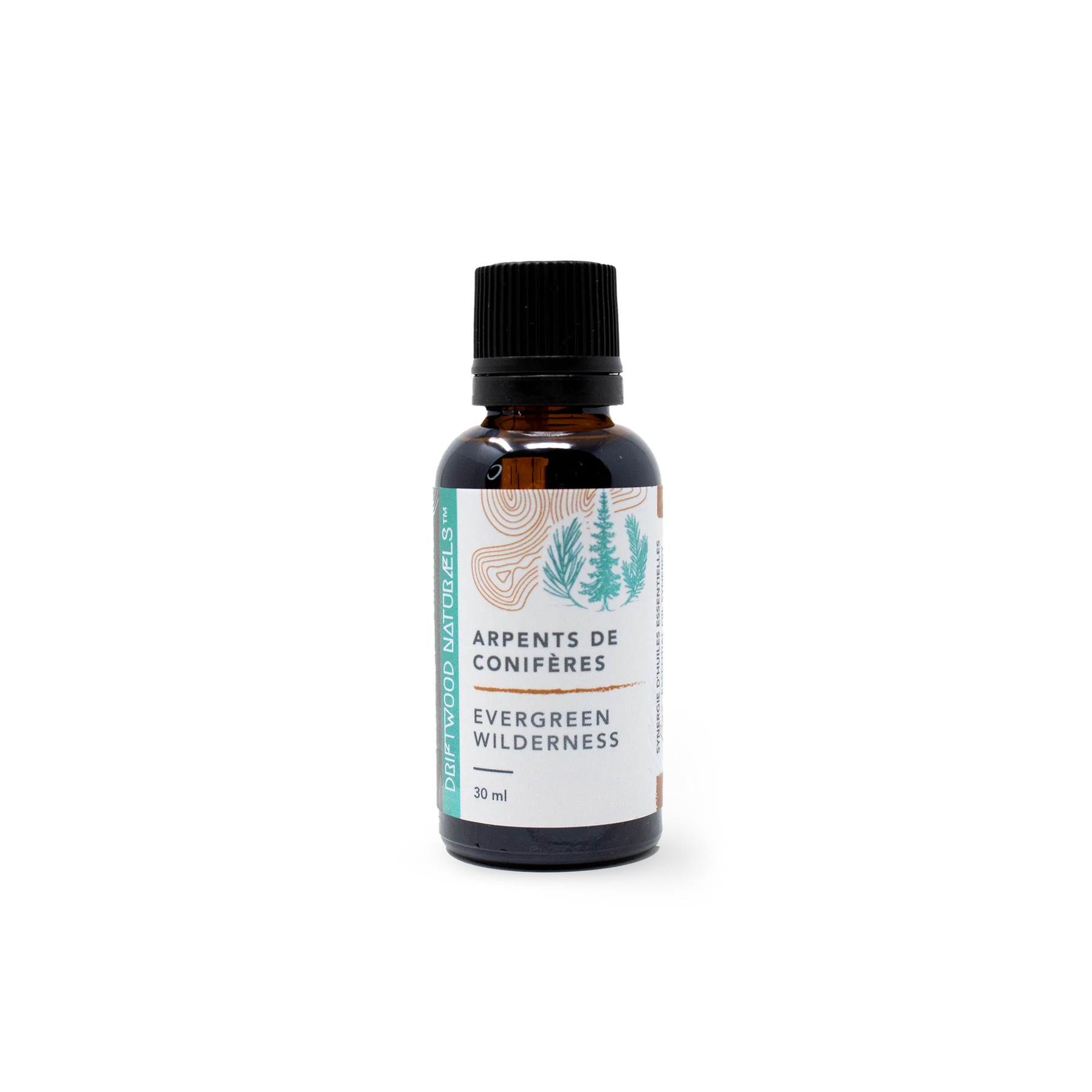 A combination of the following Essential Oils, Evergreen Wilderness envelops you in the majesty of Balsam Fir and adds a touch of spice with Red Pine and Black Spruce. Cedarwood then anchors and soothes the senses. Ideal for soothing aching muscles, this oil energizes and promotes muscular well-being.