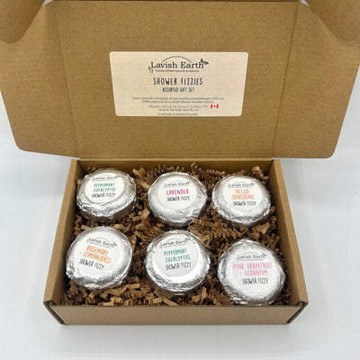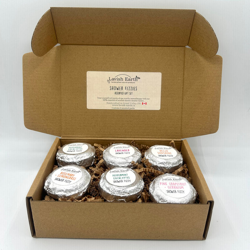 Includes 6 individually wrapped shower fizzies. All fizzies are scented with high-quality, pure essential oils.