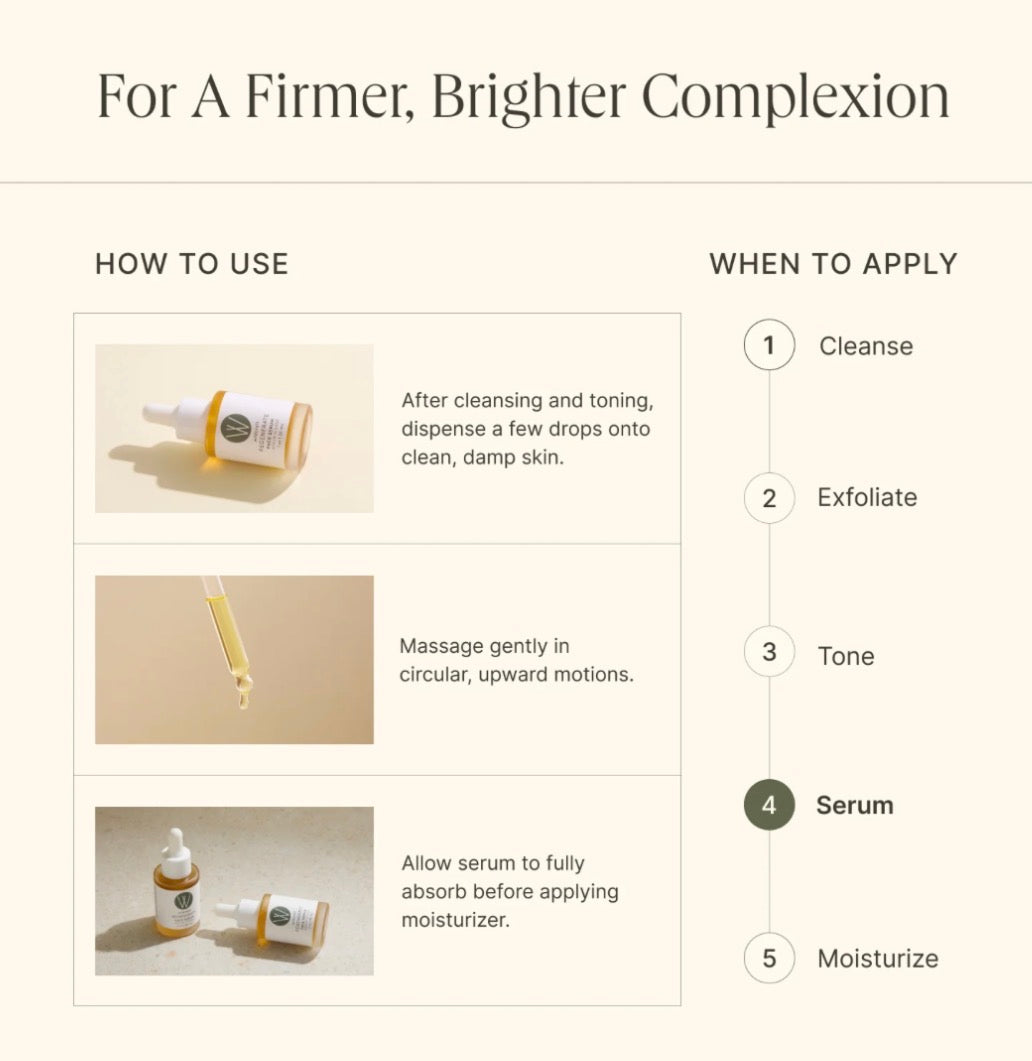 Directions: After cleansing and toning, dispense a few drops and apply to clean, damp skin in circular and upward motions. Use morning and evening.