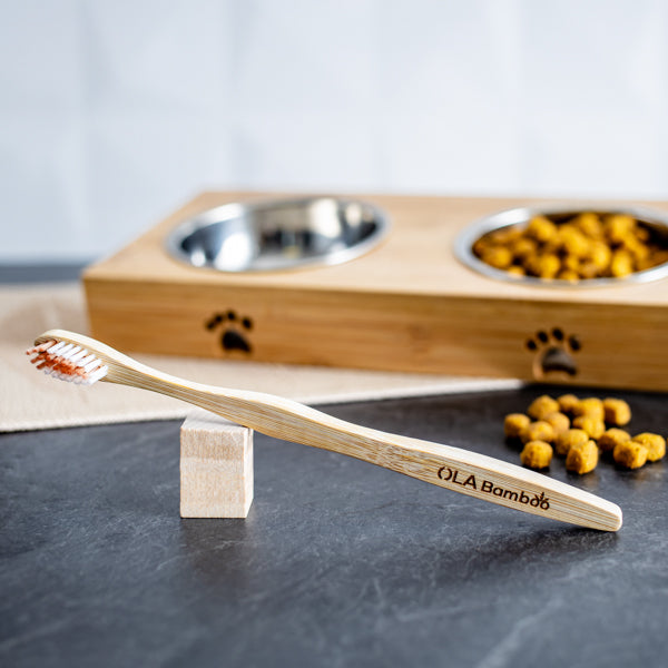 The OLA Bamboo toothbrush for dogs is an eco-friendly choice that’s also a good choice for your pet’s dental health. Eighty-five percent of cats and dogs will experience dental problems in their lives, including gum infections, plaque, tartar, bacteria or even gingivitis. The first sign of an issue is often bad breath—and one in two pet owners thinks that his or her animal sometimes has bad breath. By brushing their teeth regularly, you will be able to help them avoid a lot of issues. In the long run, bacteria from tartar can pass into the blood and spread to organs, which can cause heart or kidney failure.