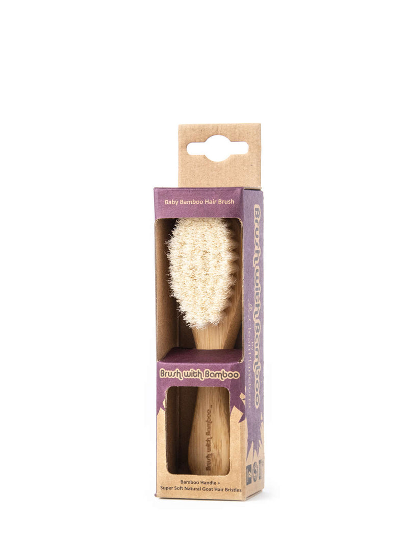 Our Baby Bamboo Hair Brush is a zero waste alternative to baby hair brushes made with synthetic materials. The Super Soft Natural Goat Hair Bristles gently massage baby’s scalp while protecting the soft spot. This hair brush grooms baby’s hair without damaging or pulling strands.