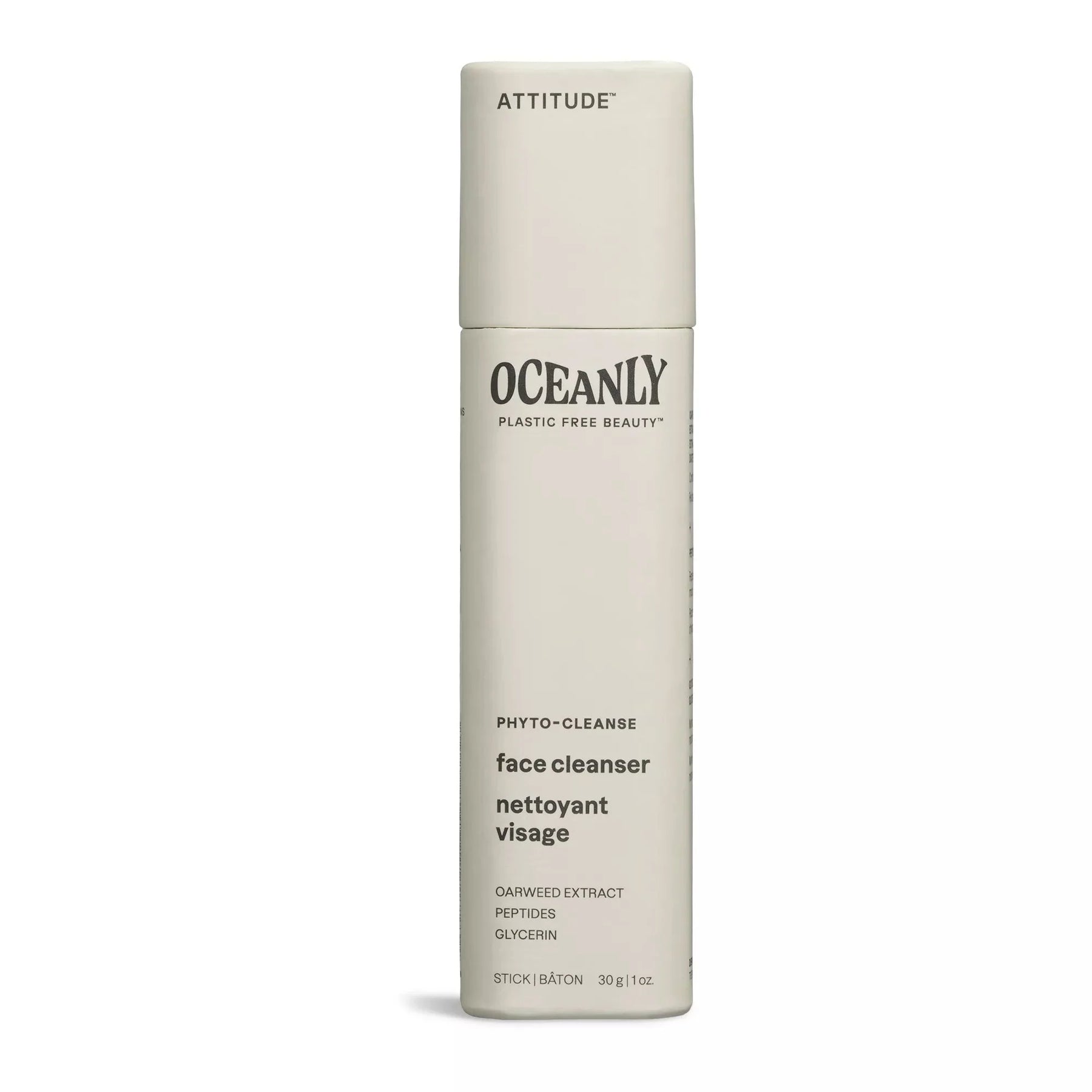 Beige deodorant-stick-shaped container with dark text, labelled as "Face Cleanser", from ATTITUDE's Oceanly, Phyto-Cleanse line.