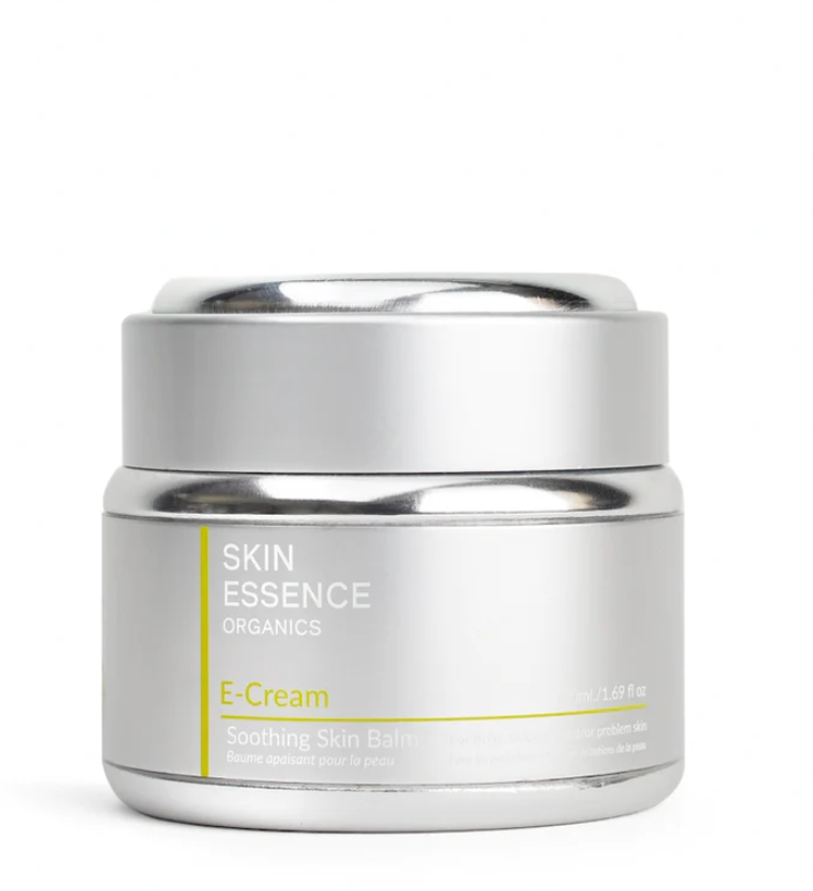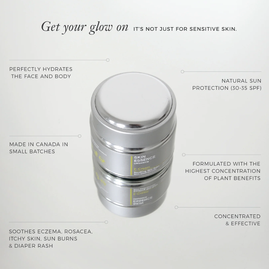 E-Cream is a delicately balanced soothing skin balm that contains a wide variety of plant extracts that offer excellent anti-aging, hydrating, calming, soothing and anti-inflammatory benefits for daily use. It is ideal for moisturizing all skin types as E-Cream helps to soothe and reduce the effects of dry skin, eczema, rosacea, redness, sunburns, insect bites, itchy skin and offers natural sun protection benefits.