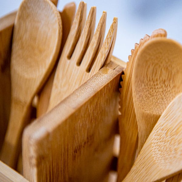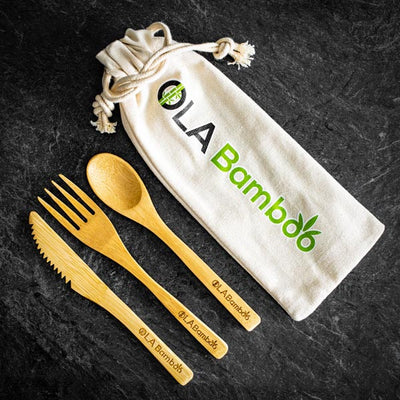 Each set contains: 1 fork, 1 knife, and 1 spoon made of bamboo along with a travel bag. All items inside are reusable and perfect for lunch boxes, the office, travelling, or at home. Replaces plastic utensils.