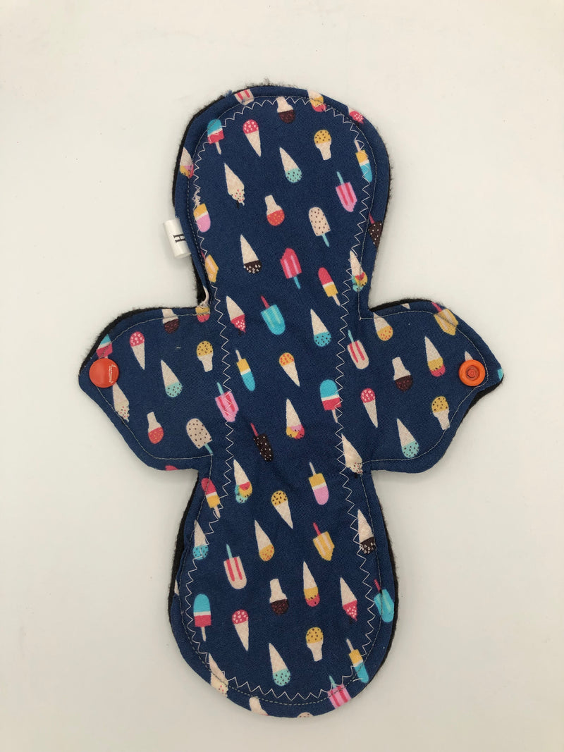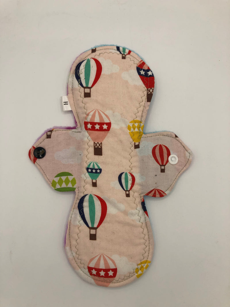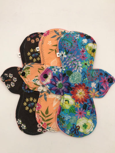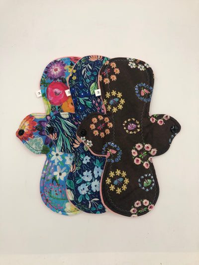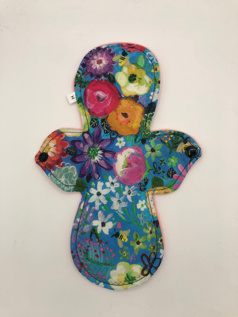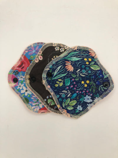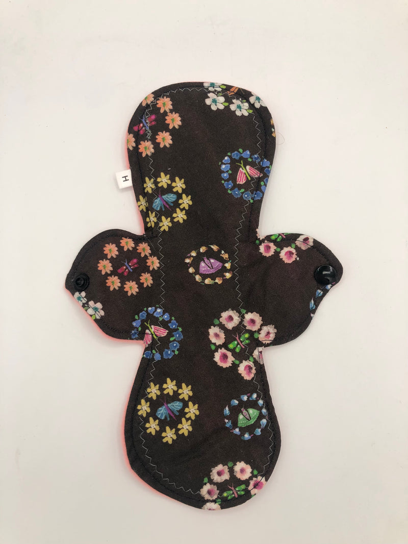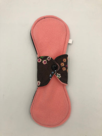 Heavy absorbency reusable pads with a cotton topper, organic bamboo core and water resistant fleece bottom with a snap closure.