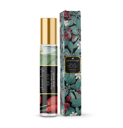 Bram: Dark and sweet with a soft amber finish. Indulge your skin to the sensual enigma that is Bram, our black cherry and deep woods-scented perfume oil.