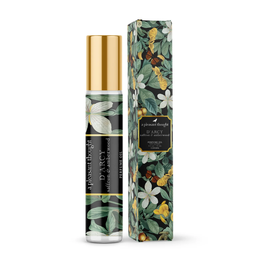 D'Arcy: An alluring blend of cool, delicate florals with warm amber and woods. Indulge your skin in the intoxicating yet romantic accords of D'Arcy, our saffron and amberwood-scented perfume oil.