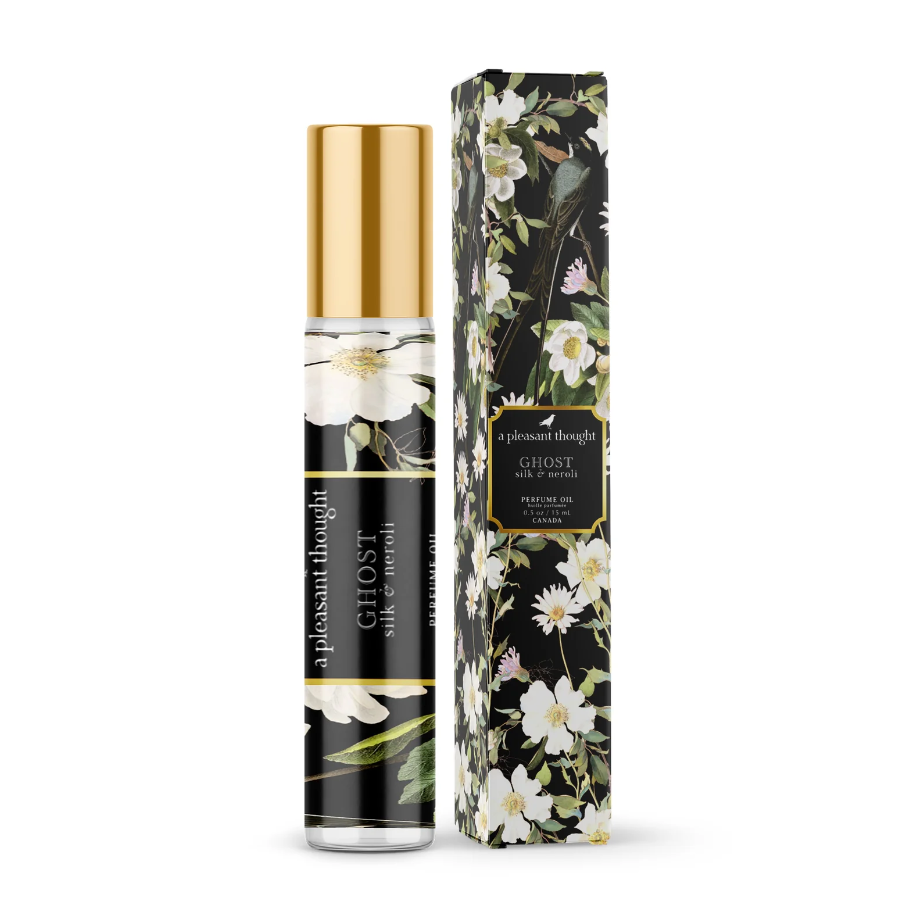 Ghost: Phantom eyes and silky sheets floating below an effervescent moon . Indulge your skin to the sultry yet spectral accords of Ghost, our silk and neroli-scented perfume oil.