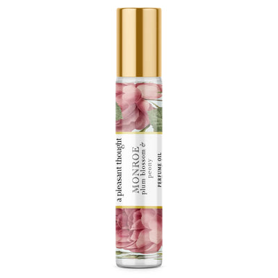 MonroeFloral and delicate with a soft woody finish. Indulge your skin to the dreamy embrace of Monroe, our plum blossom, rose, and peony-scented perfume oil.