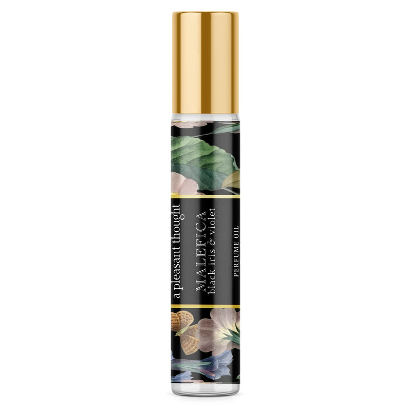 Malefica: An alluring witch's brew of powdery floral petals and earthy woods. Indulge your skin to the sophisticated and magical essence of Malefica, our black iris and violet-scented perfume oil. Floral.